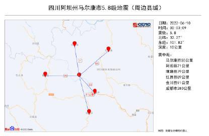 中國地震臺網(wǎng)正式測定:06月10日00時03分在四川阿壩州馬爾康市發(fā)生5.8級地震,震源深度10千米。