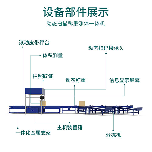 DWS設(shè)備其實(shí)用中文翻譯過來就是集稱重掃碼。測體積一體的一臺設(shè)備。這臺設(shè)備可以對接系統(tǒng),實(shí)時(shí)上傳數(shù)據(jù)。如果有需求的話,還可以添加分揀功能,根據(jù)您的需求添加多個(gè)分揀口,掃碼以后將貨物分揀到您指定的出口處統(tǒng)一管理。