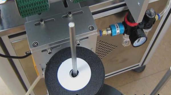 上圖是產(chǎn)品放好后.在傳送帶上運動的過程.前面有一個送料機構(gòu).可一次放幾10張砂輪片.設(shè)備自動一片一片的送上傳送帶.然后送上去貼不干膠.