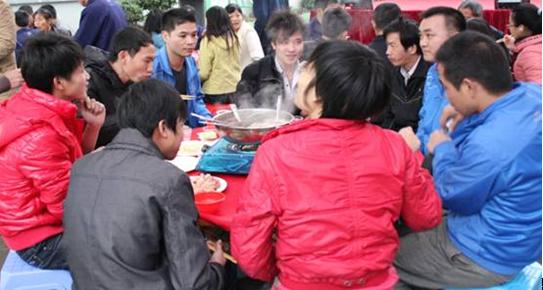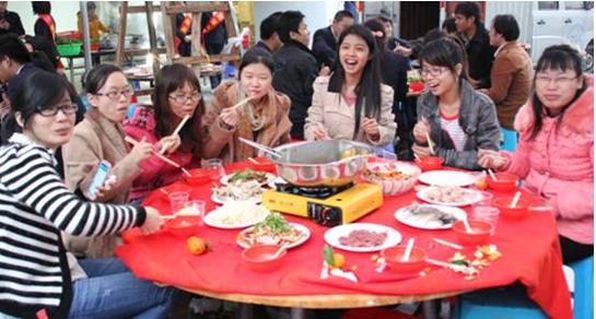 伴隨著一片片掌聲的揚起,我們的后勤部隊把所有吃的東西都搬了上來,晚宴也在進行中。灑桌上,熱湯的沸滾聲、同事們的嘻笑聲以及臺上正再進行的腦筋急轉彎的節(jié)目。表情如此多樣。