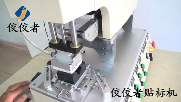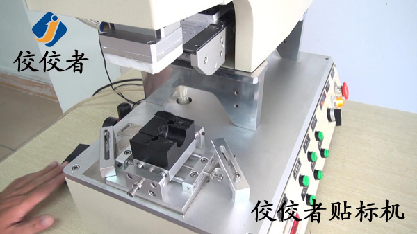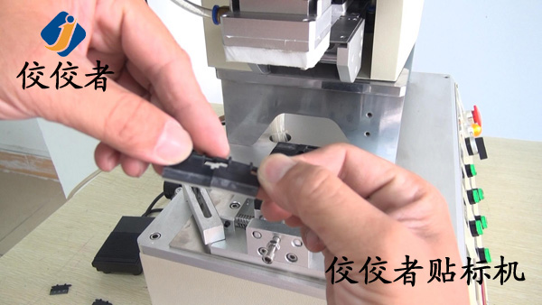 這臺高精度半自動平面貼標機是上海的一個客戶為小黑片定制的平面貼標機,貼標的時候把產(chǎn)品放到上圖的黑色小方塊上面的小槽中,機器上面部分便向下運動為小黑片貼標,如下圖: