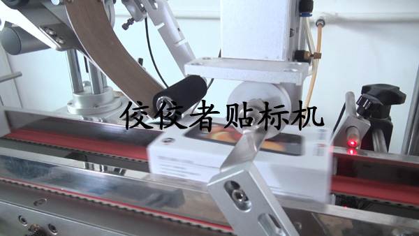 下面我們來介紹全自動上下面轉(zhuǎn)角貼標(biāo)機(jī)的貼標(biāo)全過程,首先將包裝盒放到傳送帶上,移動到下圖的黑色小柱體后面時(shí)被貼上轉(zhuǎn)角標(biāo)簽,如下圖: